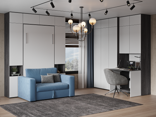 На фото показана шкаф-кровать с дополнительными пеналами и антресолями