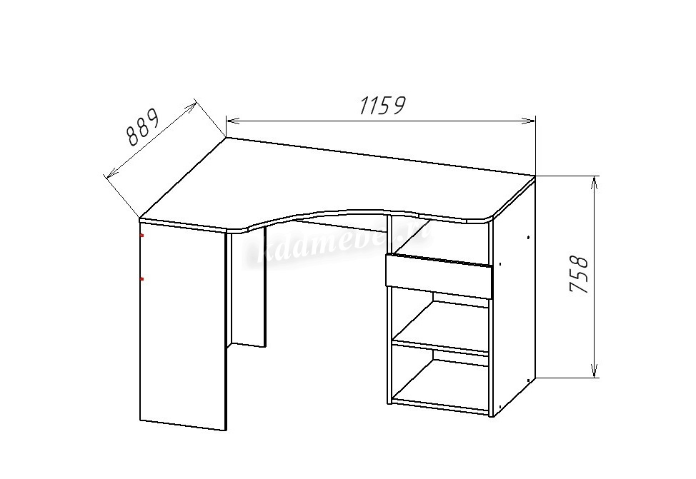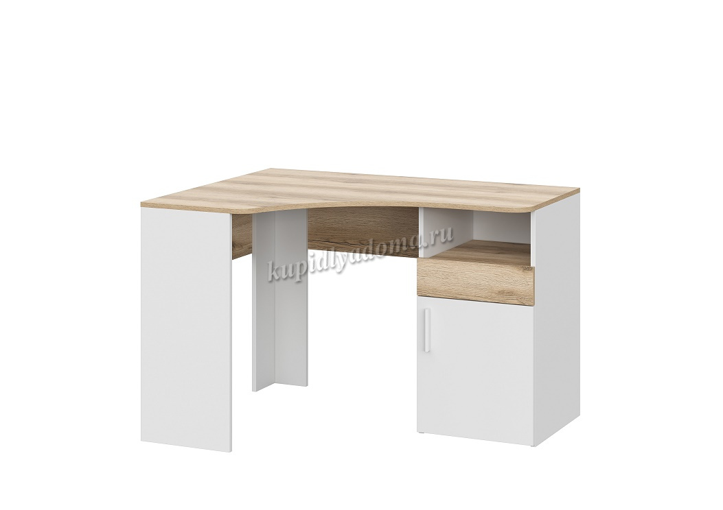 Стол письменный угловой. Дверка, внутри полка, ящик (Направляющие НПВ шариковые, без ручки) и ниша. Ручка пластик, белая